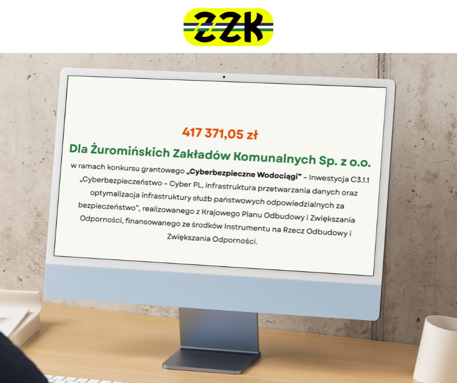 Z ogromną radością informujemy, że Żuromińskie Zakłady Komunalne Sp. z o.o. otrzymały grant w wysokości 417 371,05 zł w ramach konkursu grantowego „Cyberbezpieczne Wodociągi” – Inwestycja C3.1.1 „Cyberbezpieczeństwo – Cyber PL”, realizowanego z Krajowego Planu Odbudowy i Zwiększania Odporności, finansowanego ze środków Instrumentu na Rzecz Odbudowy i Zwiększania Odporności.
